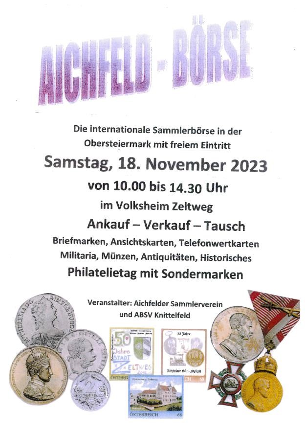 Allen Sammlern und Liebhabern von Briefmarken, Münzen, Militaria, Ansichtskarten, Telefonwertkarten und historischen Materialien wird bei dieser beliebten Tauschbörse wieder die Möglichkeit geboten, im Zeltweger Volksheim ausgiebig zu tauschen, zu handeln, zu kaufen und zu verkaufen. Vom Aichfelder Sammelverein MMM unter Obmann Josef Grillitsch ausgerichtet, hat sich die Aichfeld-Börse mittlerweile zu einem bedeutungsvollen Treffpunkt für alle Sammler aus der gesamten Obersteiermark und darüber hinaus entwickelt und ist für alle Interessierten ab 10:00 Uhr geöffnet.