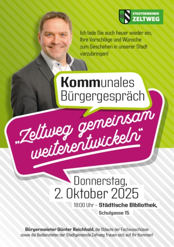 Am 2. Oktober 2025 mit Beginn um 18:00 Uhr besteht in der Städtischen Bibliothek Zeltweg die Möglichkeit, gemeinsam mit den Obleuten der Fachausschüsse sowie den Verantwortlichen der Stadtgemeinde Zeltweg über anstehende Probleme und Fragen zu diskutieren.