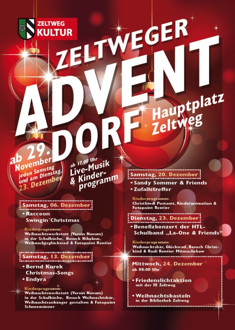 Stimmungsvolle Einbegleitung auf die bevorstehenden Weihnachtsfeiertage mit Live-Musik und Kinderprogramm im Adventdorf Zeltweg!