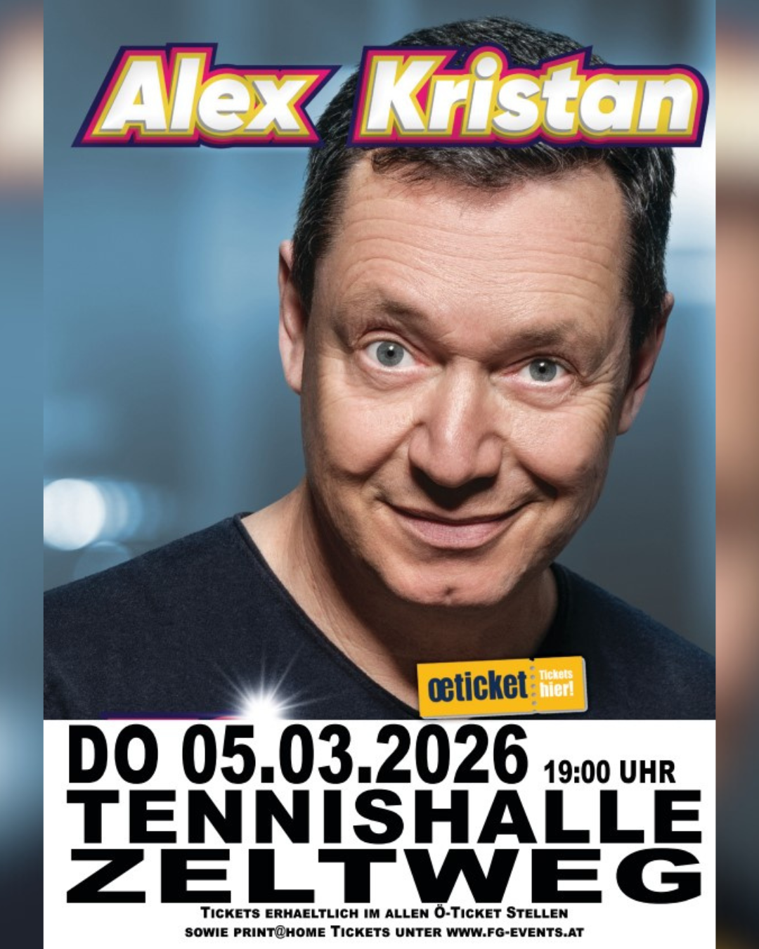 Am 5. März 2026 ist es soweit: Nach dem großen Erfolg im letzten Jahr gastiert Alex Kristan erneut mit „50 Shades of Schmäh““ in der Tennishalle Zeltweg.
