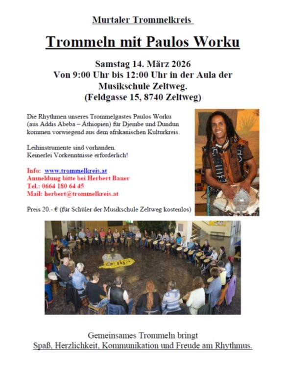 Um Anmeldung wird gebeten unter 0664/1806445 bzw. herbert@trommelkreis.at (Obmann Herbert Bauer, BBakk.)