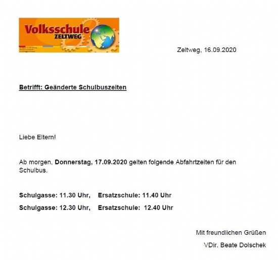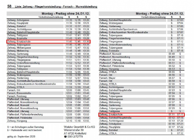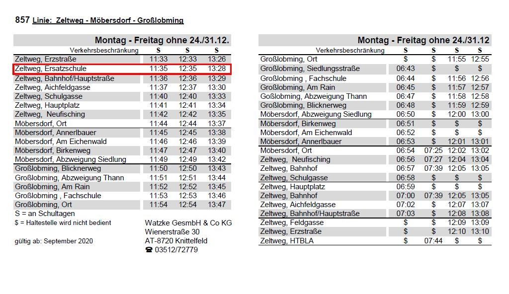 Aufgrund der Übersiedelung der Volksschule Zeltweg in die Musikschule und der damit einhergehenden Installierung einer Ersatzhaltestelle gibt es ab September 2020 einen neuen Schulbus-Fahrplan in Zeltweg: