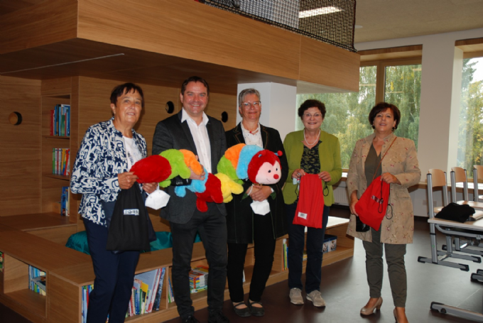 Sozialausschuss-Obfrau GR Rita Hartner, Bgm. Günter Reichhold, VS-Direktorin Dipl.-Päd Beate Dolschek, Familienausschuss-Obfrau Vzbgm. Brigitte Konrad und Schulausschuss-Obfrau GR Anneliese Steinkellner (v. l.) sowie Leseraupe „Rosi“ in einer der neuen Lesegalerien in der Volksschule Zeltweg