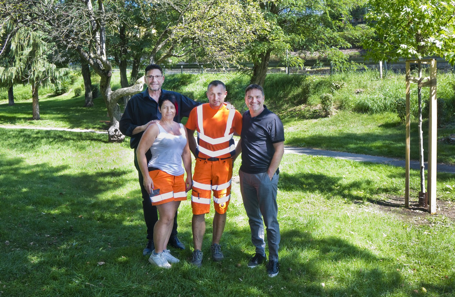 Dipl.-Ing. (FH) Herwig Habian, Stadtgärtnerin Ingrid Pichler und Christoph Leitner vom Städtischen Wirtschaftshof sowie Bgm. Günter Reichhold (v. l.).