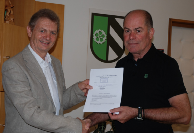 NMS-Direktor Rudolf Muhrer und Bgm. Hermann Dullnig bei der Übergabe der Vereinbarung, welche vorsieht, dass 50 Prozent der erzielten Energieeinsparungen in der NMS Zeltweg den Schülern in Form von zusätzlichem Schulbedarf zugutekommen.