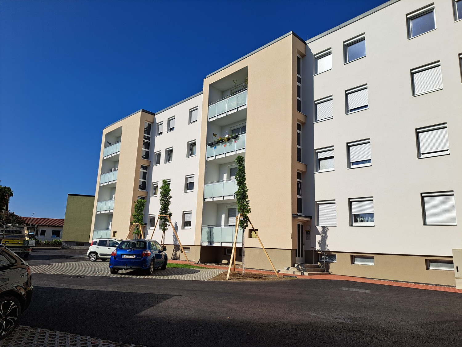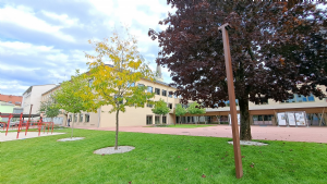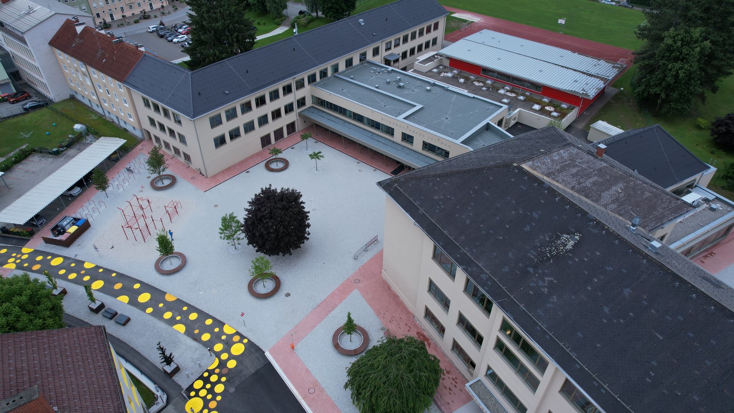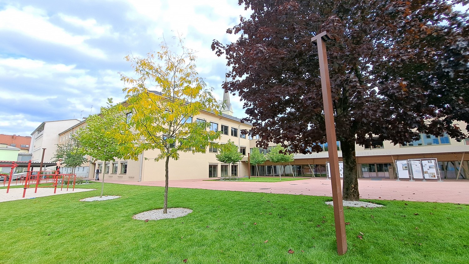 Eine zusätzliche Aufwertung der Anlage erfolgte im Sommer 2025: zusätzliche Bäume wurden gepflanzt und die verbleibenden Freiflächen wurden mit Rollrasen begrünt. |